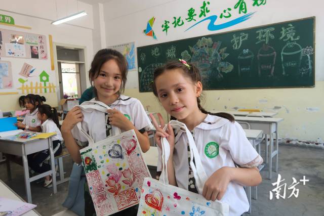 学生们展示自己制作的帆布袋。