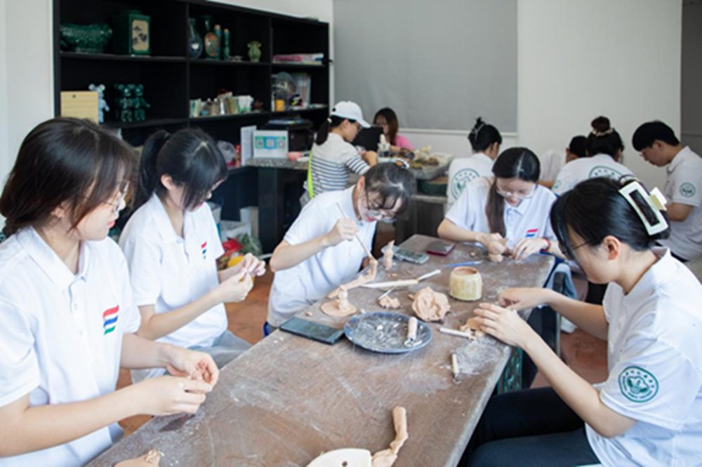 为了更深入地体验陶塑瓦脊工艺的魅力,实践队员亲自参与到手工制作陶塑中。何湛泉和女儿何晓桦亲临现场指导,并与队员分享制作陶塑的经验与陶塑故事。在陶塑过程中,队员们需要不断地调整形状和位置,才能让手中的泥土捏塑成型。陶塑过程中,实践队员深切感受到,创意固然重要,但想制作出优秀的陶艺品,只有保持不断学习探索、精益求精的匠人精神,才能创作出独具特色的陶塑作品。