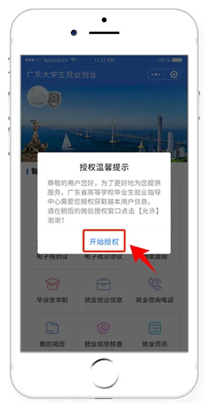 1.进入“广东大学生就业创业”官方小程序色情网自动显示授权温馨提示,点击“开始授权”弹出小程序授权窗口。