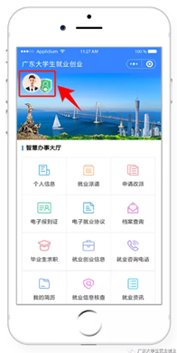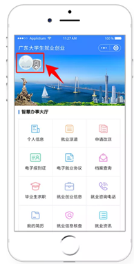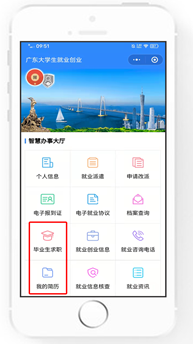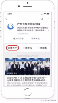 搜索“广东大学生就业创业”官方微信公众号并点击关注,进入菜单栏“办事大厅”。