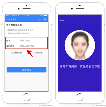 2.进入“学籍绑定”页面,点击“开始验证”,并完成人脸识别身份认证。