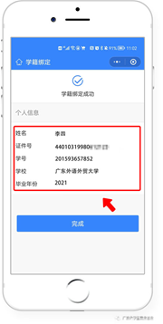 3.“刷脸”成功后,即可进行“学籍绑定”,点击“完成”可进入“个人信息”绑定的操作。